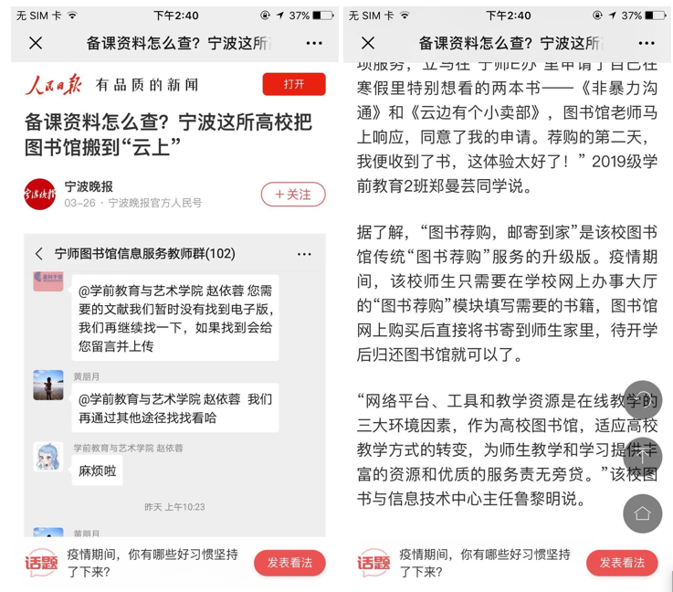 值得一提的是,疫情期间校方图书线上借阅服务被宁波晚报、人民日报等媒体报道。