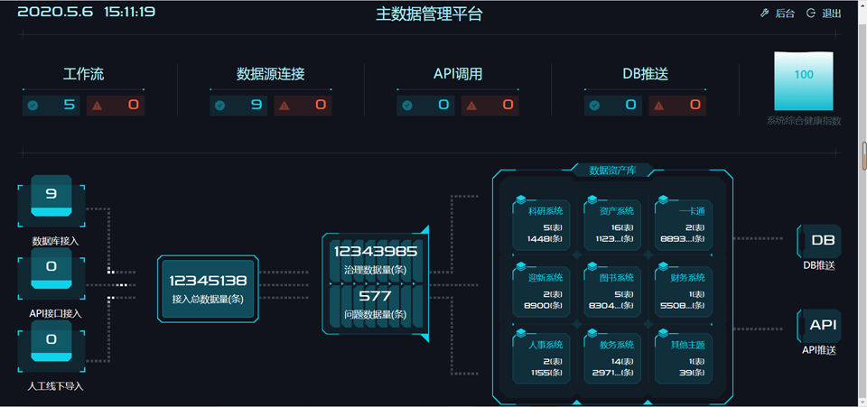 数据平台和数据可视化建设,解决学校各个业务系统数据信息孤岛现状,打通数据通道,突破数据壁垒,实现异构系统的数据整合。目前已经接入教务、资产、档案、图书、一卡通等系统,累计上千万条基础数据,为“让数据活起来”的智慧校园建设目标的实现,奠定了底层基石。