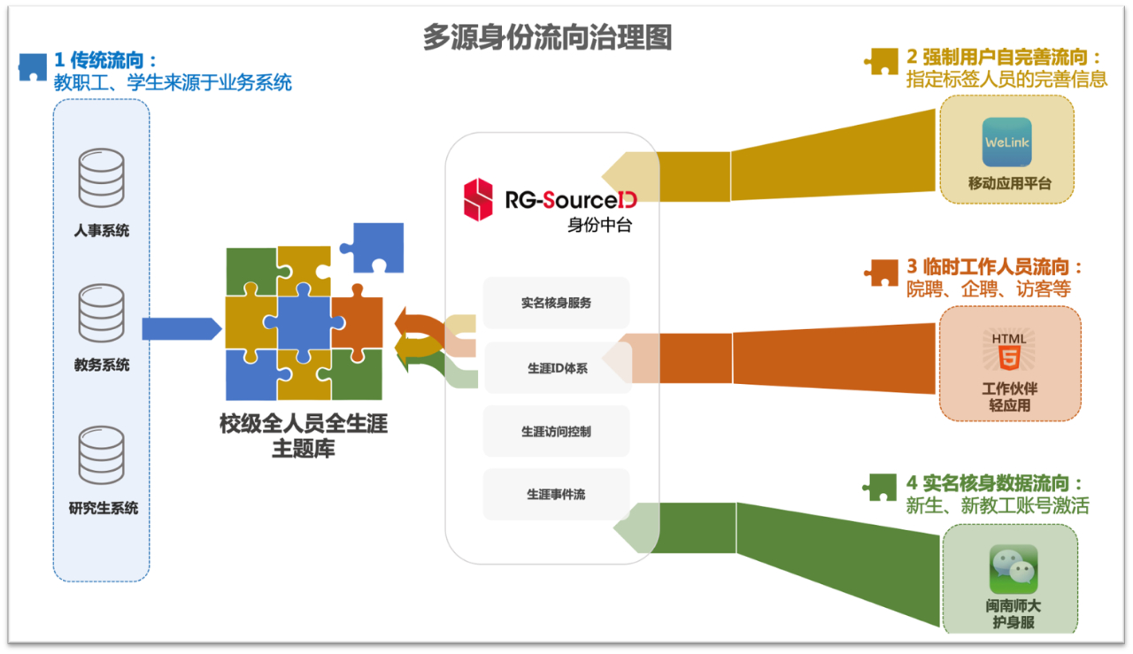 为解决以上问题,闽南师范大学信息化建设与管理办公室经过不断调研分析,并对诸多厂家的方案进行研究和探讨,结合学校当前现状,提出:以统一认证为纽带,促进师生身份信息的高效完善和不断流转,为学校业务流转奠定基础;以首次认证为抓手,强制完成师生身份核验,保证身份信息可信;以身份中台为基础,构建人脸信息与身份信息相结合的统一身份库,形成“师生——信息部门——学校”人脸建设的闭环管理。