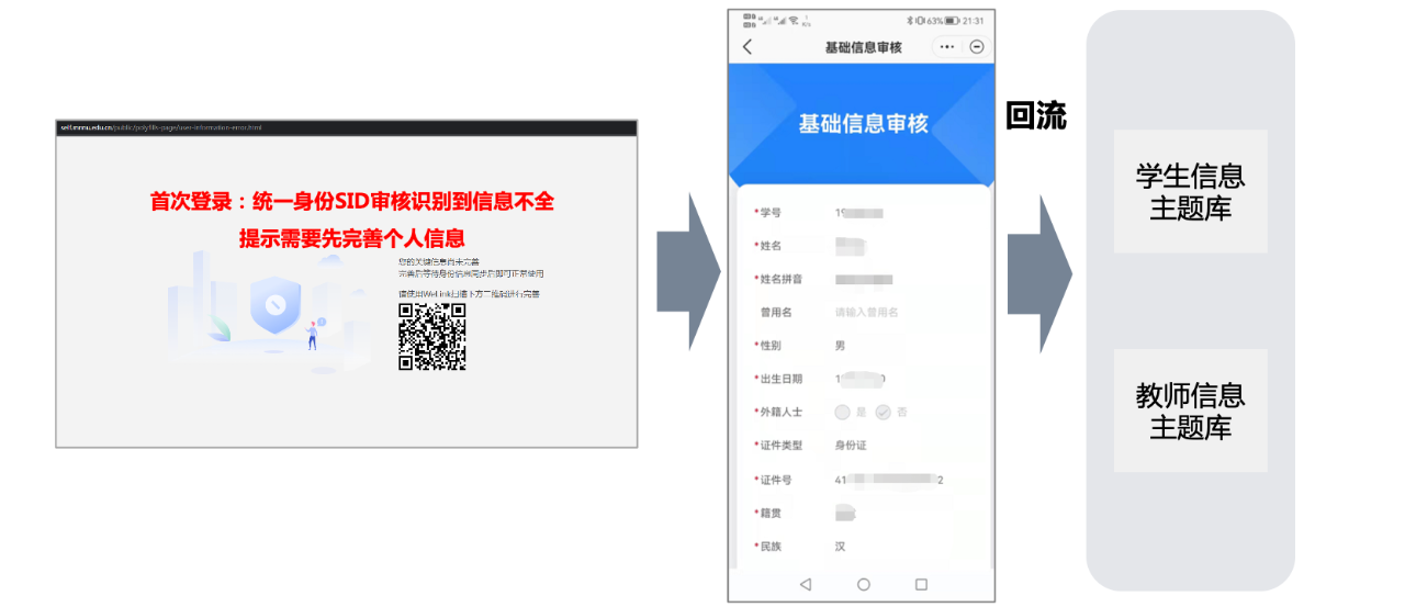 信息审核保障身份数据质量:SID和Welink小程序打通,利用数据回流补全用户信息,并通过回流同步用户信息到主题库。比如:SID从数据中心采集某学生的身份信息,通过采集、治理后,身份信息仍然不全,该生在统一认证时会进被拦截,需要补全信息后正常使用。SID将获取到用户信息,通过回流同步用户信息到主题库。彻底解决师生线上填报效率低的问题,保障数据全面准确,提升业务部门找人、办事效率;同时师生可在WElink自助修改密码,及时回流到到SID和主题库,保障全校业务中师生手机号码更新及时;