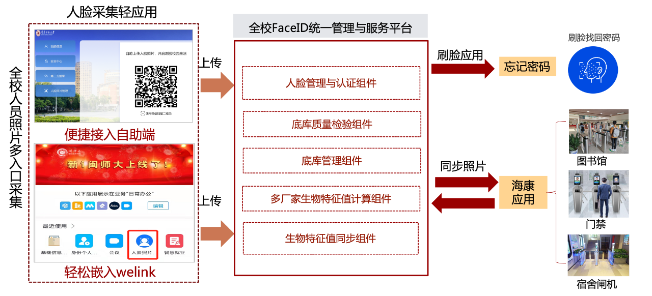 人脸建设缺乏统一规划,导致师生体验不佳:为方便师生生活学习,同时保障校园安全,学校各部门广建人脸应用,如教务、图书馆、保卫处等。各部门单独采集照片,导致师生体验不佳;应用建设周期长,难以快速响应师生需求;人脸照片多处存储,存在安全隐患;人脸信息和师生身份信息剥离,师生信息发生变动时,学校管理维护困难;学校需要构建统一人脸库,保障人脸信息安全,提升学校人脸效率,为师生提供更好的服务。