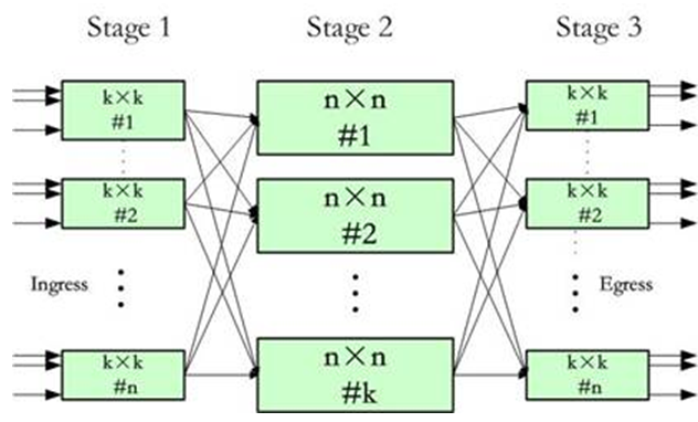 CLOS交换架构可以做到严格的无阻塞(Non-blocking)、可重构(Re-arrangeable)、可扩展(Scalable)。