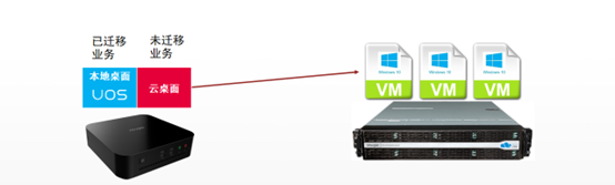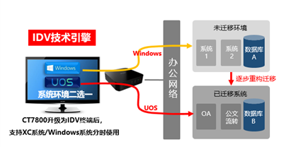 以VDI技术为例,可通过“双桌面”的方式,已经适配过的应用在一个桌面,未适配的应用继续跑在原有系统的虚拟机里,两个桌面可以自由切换。如此,可保障切换工作的平滑过渡,最终原有系统虚拟机里未适配的应用越来越少,直被完全切换。而如果使用IDV技术,同样也可以利用“双桌面切换”的技术,本地终端上存储两个操作系统镜像,一键切换。