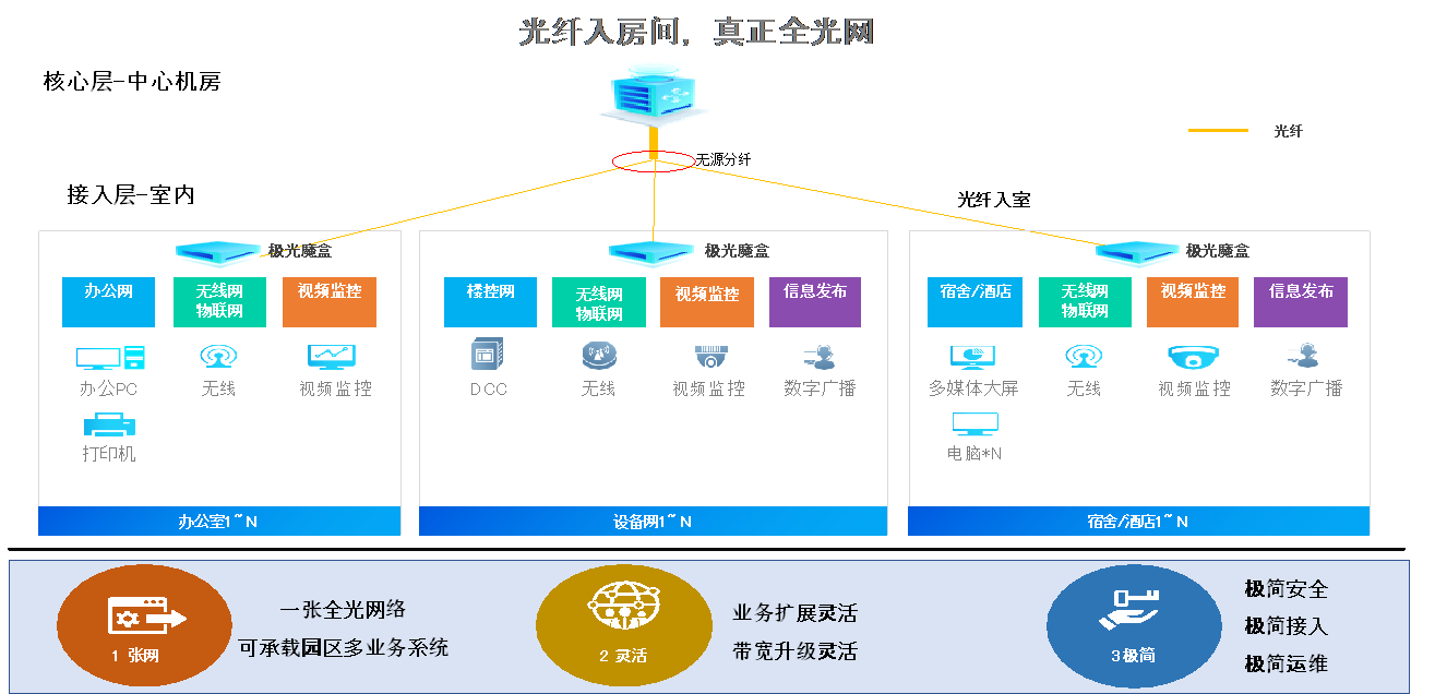 全光纤链路从核心到用户端1:1部署,用户独享光纤带宽,做到高性能。同时根据业务转发性能需要,无需调整链路,可支持1G/10G/40G/100G带宽平滑升级,信息点位可选择配置4/8/16/24等不同端口形态的企业级极光魔盒,避免了GPON分光后性能受限问题和在业务调整时重新计算光分比、拉光纤等工作量,以及传统以太网重新拉线的成本增加;